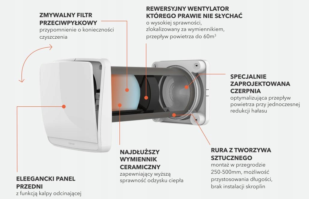 Specjalna konstrukcja czerpnio-wyrzutni generuje optymalny przepływ powietrza, redukcję hałasu oraz wspomaga efektywny odzysk ciepła.