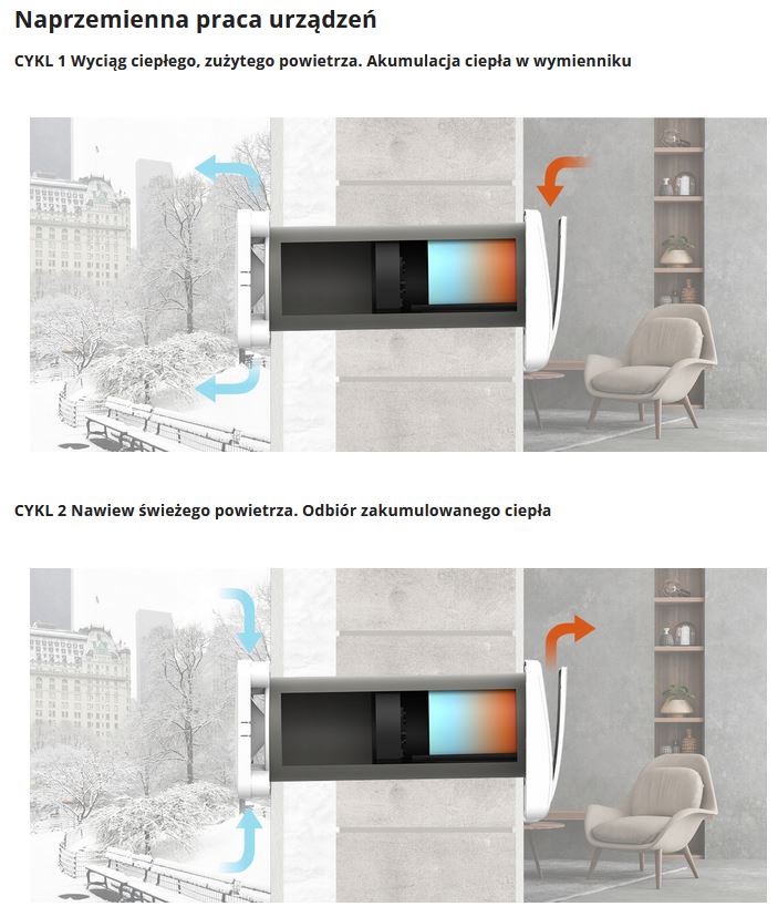 Rekuperator pracuje cykliczne, w pierwszej kolejności wyciągając zużyte, brudne i ogrzane powietrze z pomieszczenia, a następnie nawiewając czyste, świeże ogrzane w wymienniku ceramicznym.