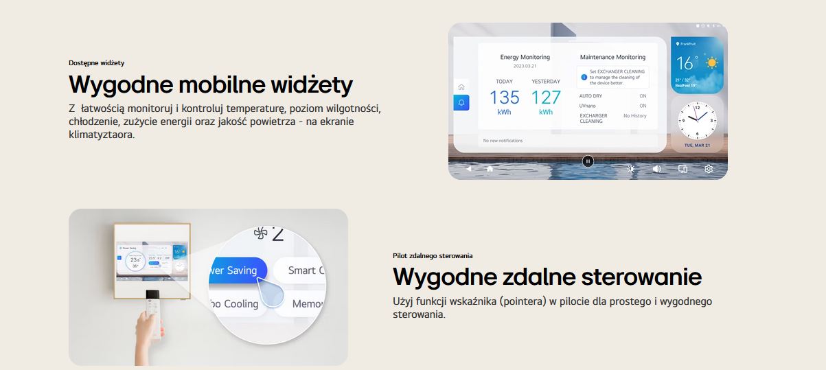 Zaawansowane funkcje, takie jak aplikacja mobilna LG ThinQ, oferują łatwe i intuicyjne zarządzanie ustawieniami oraz monitorowanie pracy klimatyzatora z każdego miejsca, zapewniając niezrównany komfort użytkowania.