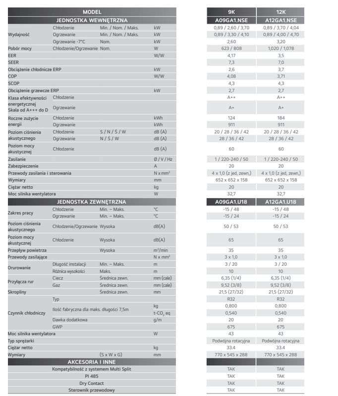 Praca klimatyzacji jest cicha (20-45 dB) oraz energooszczędna (klasa energetyczna A++ dla chłodzenia).