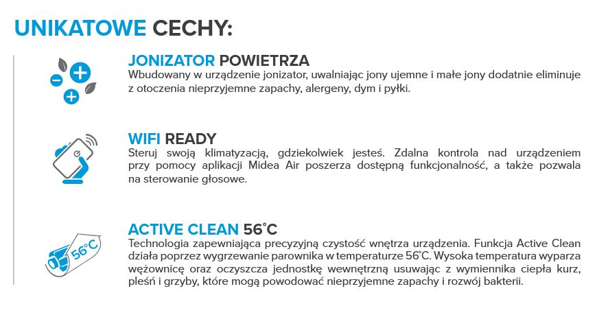 Funkcje zastosowane w urządzeniu Midea Blanc Pro: