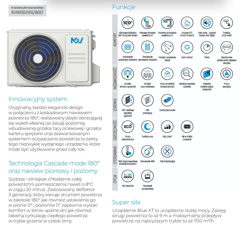 Oryginalny, bardzo elegancki design w połączeniu z kaskadowym nawiewem powietrza 180°, realizowany dzięki obracającej się wokół własnej osi żaluzji poziomej, wbudowanej grzałce tacy ociekowej i grzałce karteru sprężarki oraz zaawansowanym systemem oczyszczania powietrza to zalety tego niezwykle wydajnego urządzenia, które może być użytkowane przez cały rok.