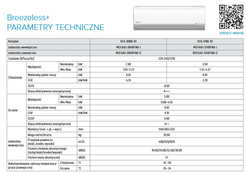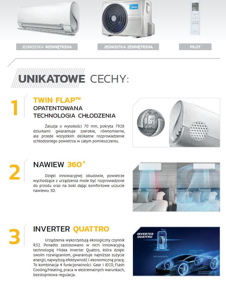 Klimatyzatory Midea Breezeless+ są wyposażone w grzałkę tacy skroplin w standardzie. To kluczowy element, który zapewnia ich niezawodną pracę nawet w ekstremalnie niskich temperaturach zewnętrznych.