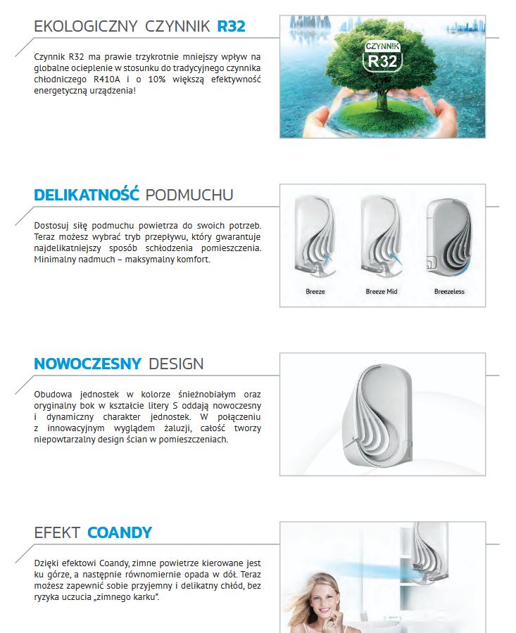 Obudowa S-wing nadaje nowoczesny i dynamiczny charakter jednostce, ale przede wszystkim umożliwia rozprowadzanie powietrza w 3 kierunkach jednocześnie, co daje uczucie nawiewu 3D.