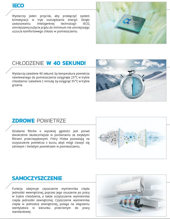 Za pomocą jednego przycisku, możliwe jest przełączenie klimatyzacji w tryb oszczędzania energii, dzięki zastosowaniu inteligentnej technologii iECO. Wystarczy zaledwie 40 sekund, aby temperatura powietrza nawiewanego osiągnęła 23°C w trybie chłodzenia i zaledwie 1 minutę aby osiągnęła 35°C w trybie grzania.