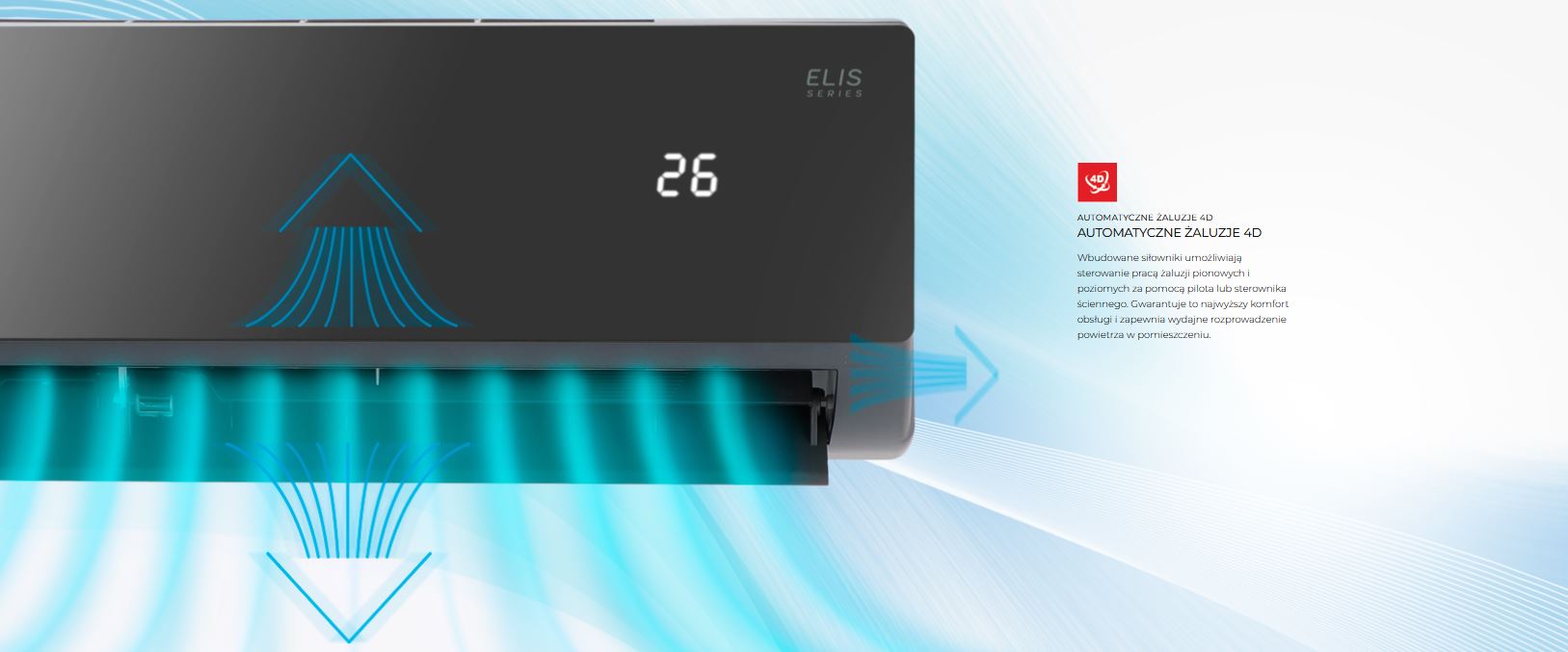 Wykorzystanie automatycznej żaluzji 4D pozwala na dostosowanie kierunku nawiewu w dowolny sposób zarówno w pionie, jak i w poziomie. Użytkownik może to zrobić za pomocą bezprzewodowego pilota lub sterownika ściennego. System nawiewu 4D eMOTO oferuje ogromną dowolność dostosowania nadmuchu do swoich preferencji i zapewnić sobie najwyższą efektywność kontroli temperatury oraz bardzo duży komfort obsługi klimatyzatora ściennego Rotenso Elis X.