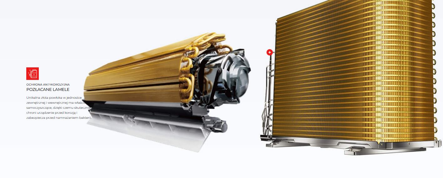 Antykorozyjne pozłacane lamele oraz zestaw filtrów powietrza skutecznie wspierają stałą wydajność urządzenia i gwarantują wysoką jakość nawiewu.