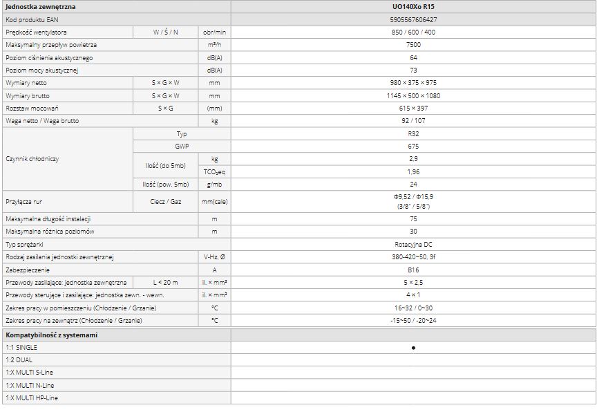 Jest dostępny w siedmiu wydajnościach (od 5,3 kW do 15,2 kW) i w klasie chłodzenia A++.