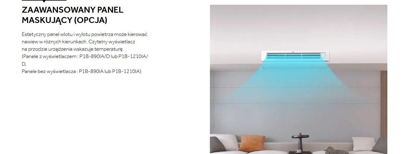 Do klimatyzatorów Slim DUCT można zamontować zaawansowany panel (opcja), który kieruje nawiew w różnych kierunkach, jednocześnie zwiększając efektywność rozprowadzenia nawiewu w pomieszczeniu; panele dostępne z wyświetlaczem temperatury lub bez.