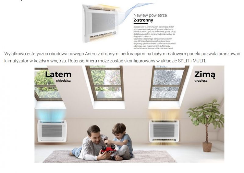Rotenso Aneru X to klimatyzator konsolowy, który łączy nowoczesny design z funkcjonalnością. Jego matowa obudowa i unikalna konstrukcja wyróżniają go na tle innych urządzeń. Dzięki możliwości niezależnego sterowania nawiewem w dwóch kierunkach – góra i dół – świetnie sprawdza się w nietypowych przestrzeniach, wymagających niestandardowych rozwiązań.