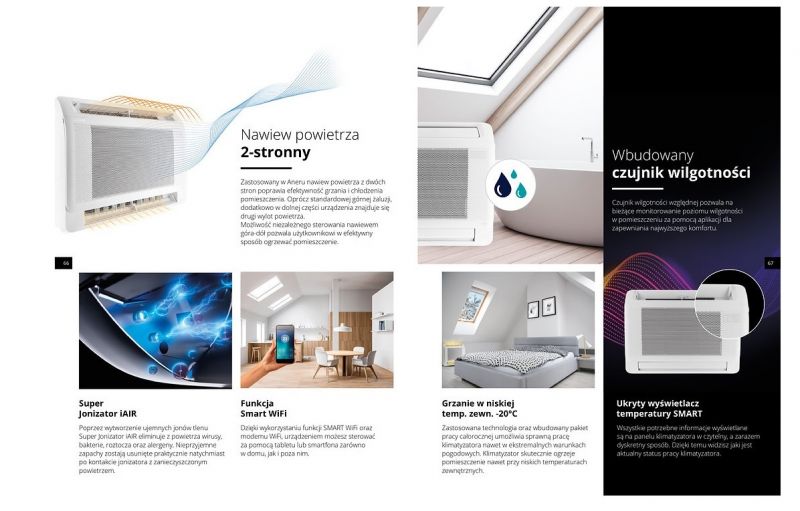 Dwustronny nawiew góra-dół umożliwia niezależne sterowanie przepływem powietrza, co zapewnia równomierne chłodzenie latem i efektywne ogrzewanie zimą.