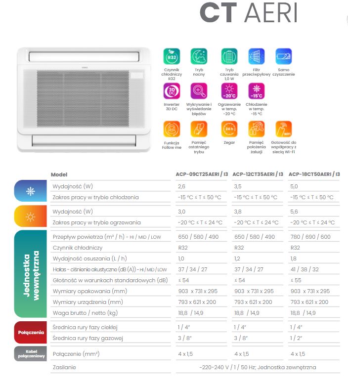 Klimatyzator konsolowy Vivax CT Aeri wykorzystuje nowoczesny czynnik chłodniczy R32, który jest bardziej przyjazny dla środowiska w porównaniu do starszych czynników, takich jak R410A. Dzięki niższemu potencjałowi tworzenia efektu cieplarnianego (GWP) oraz większej efektywności energetycznej, R32 przyczynia się do zmniejszenia emisji CO₂ i obniżenia kosztów eksploatacji.