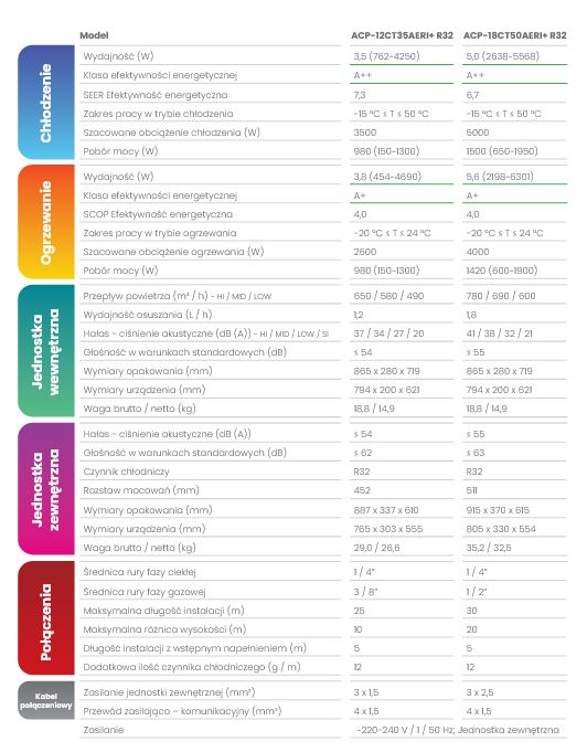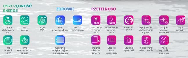 Urządzenie cechuje się wysoką efektywnością energetyczną, posiada klasę energetyczną A++ w trybie chłodzenia oraz A+ w trybie ogrzewania, co pozwala na znaczną redukcję zużycia energii i obniżenie kosztów eksploatacji.