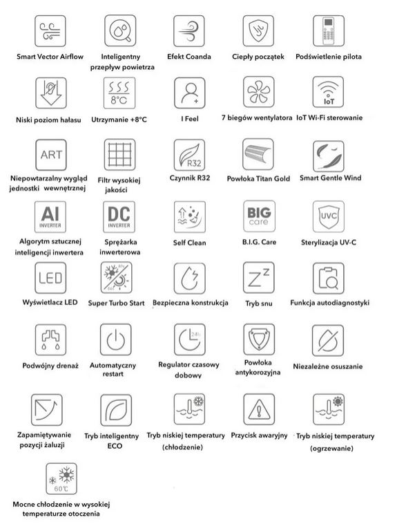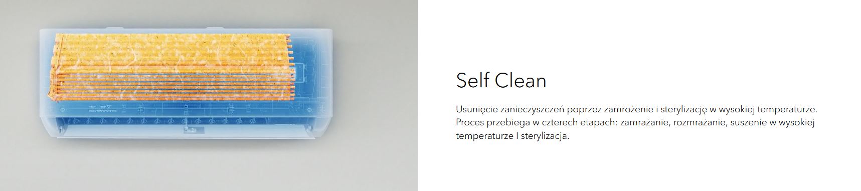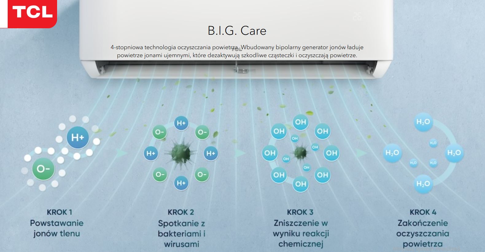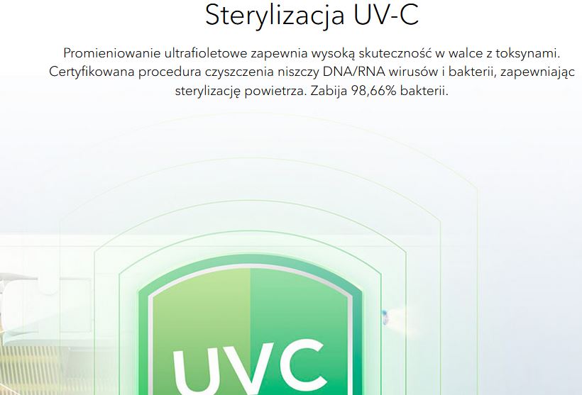 Klimatyzator został wyposażony w jonizator powietrza, który w 4 krokach rozprawia się ze szkodliwymi cząsteczkami. Proces oczyszczania powietrza wspomaga tutaj sterylizacja UV-C niszcząca 98,66% bakterii.