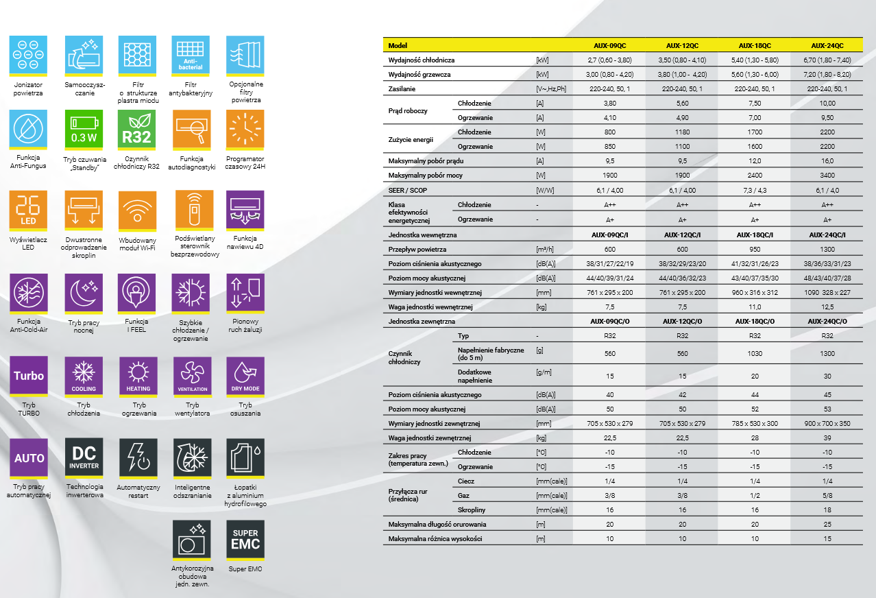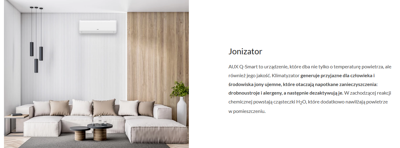 AUX Q-Smart to nowoczesny klimatyzator ścienny, który połączył w sobie najważniejsze funkcje zapewniające komfort użytkownikowi oraz wyjątkowy design będący eleganckim wykończeniem nowoczesnego wnętrza.