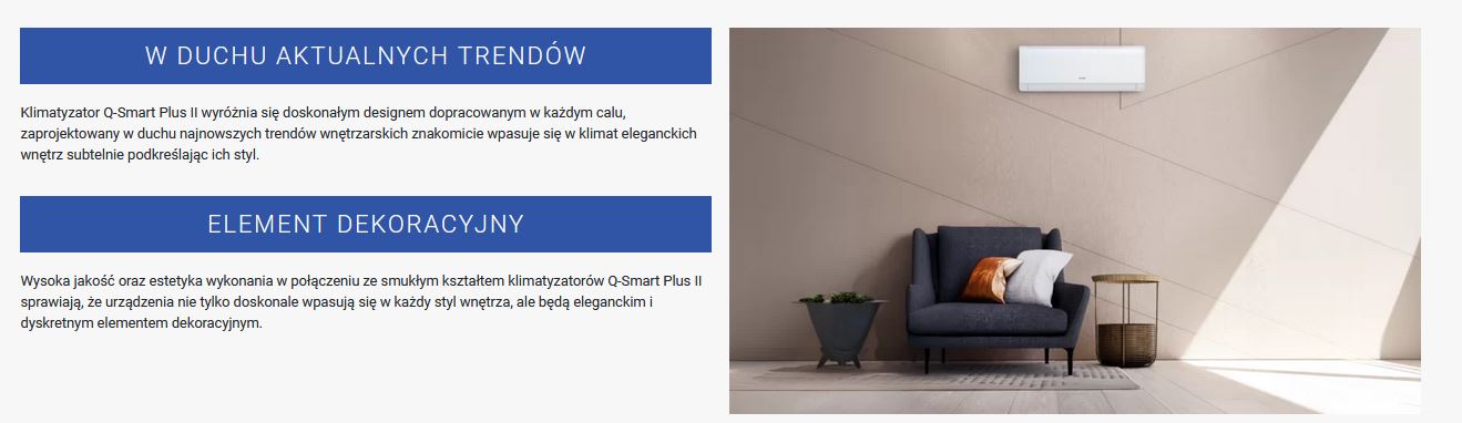 Wysoka jakość oraz estetyka wykonania w połączeniu ze smukłym kształtem klimatyzatorów Q-Smart Plus II sprawiają, że urządzenia nie tylko doskonale wpasują się w każdy styl wnętrza, ale będą eleganckim i dyskretnym elementem dekoracyjnym.