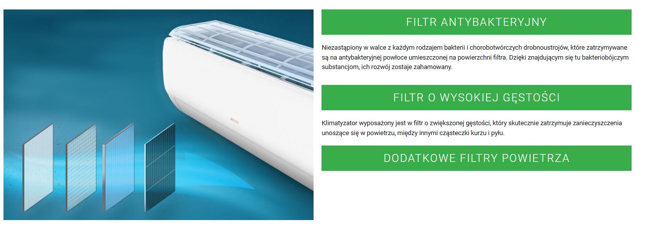 Wewnątrz jednostki ściennej znajduje się zestaw filtrów dbający o dobrą jakość powietrza, a tym samym o zdrowie użytkowników.
