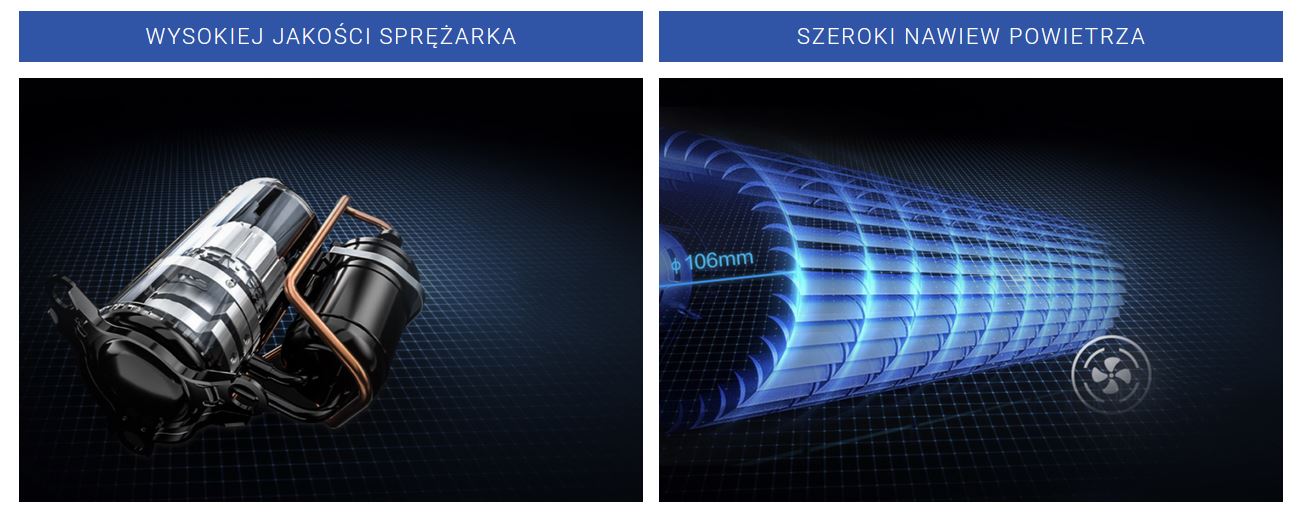 Agregat wykorzystuje wysokiej jakości sprężarkę inwerterową – odpowiedzialną za wysoką kulturę pracy klimatyzatora.