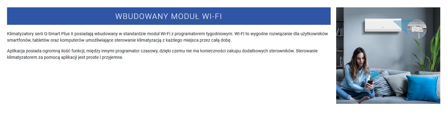 Klimatyzatory serii Q-Smart Plus II posiadają wbudowany w standardzie moduł WI-FI z programatorem tygodniowym. WI-FI to wygodne rozwiązanie dla użytkowników smartfonów, tabletów oraz komputerów umożliwiające sterowanie klimatyzacją z każdego miejsca przez całą dobę.