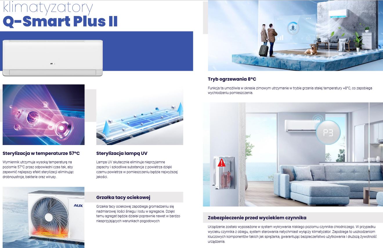 Nowoczesny klimatyzator AUX Q-Smart Plus oferuje również możliwość utrzymywania stałej temperatury na poziomie +8°C. Dzięki temu możliwe jest szybsze osiągnięcie oczekiwanych warunków w trybie grzania. To rozwiązanie jest często wykorzystywane w domkach letniskowych lub innych budynkach użytkowanych sezonowo, pozwalając uniknąć zamarznięcia i awarii instalacji wodnej.