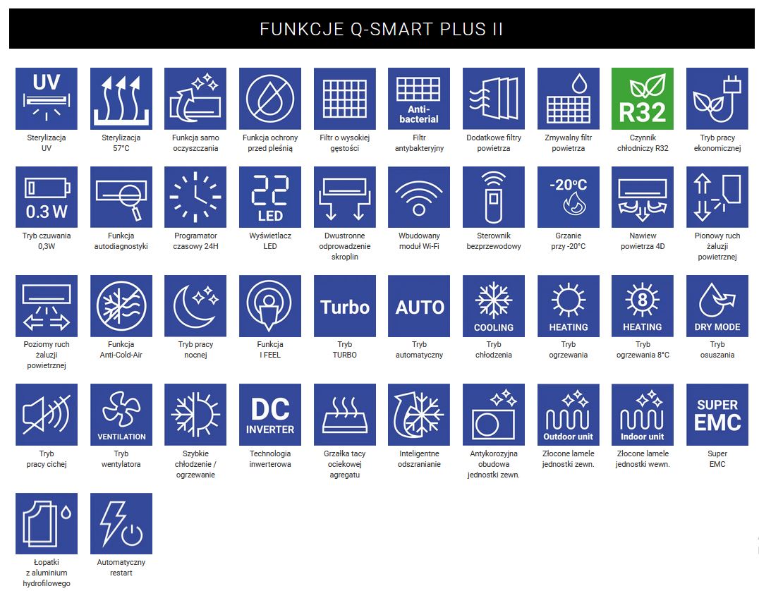 Grzałka tacy ociekowej zapobiega gromadzeniu się nadmiaru śniegu i lodu w agregacie, zapewniając jego niezawodne działanie nawet w bardzo trudnych warunkach pogodowych. Funkcja grzania przy temperaturach sięgających nawet -22°C umożliwia korzystanie z klimatyzatora zimą, co jest szczególnie ważne w regionach o surowych zimach. Klimatyzator z serii Q-Smart Plus efektywnie ogrzewa pomieszczenia, zapewniając komfort cieplny mieszkańcom nawet w ekstremalnych warunkach.