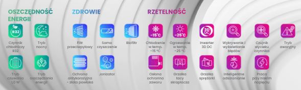 Ogromną zaletą, sprawiającą, że urządzenie jest tak bardzo oszczędne jest funkcja ECO, po włączeniu której zużywa się do 60% mniej energii elektrycznej. Dodatkowo klimatyzator może pracować w trybie grzania nawet do -20°C temperatury zewnętrznej, a także w trybie chłodzenia do -15°C. (posiada wbudowaną grzałkę tacy skraplacza)