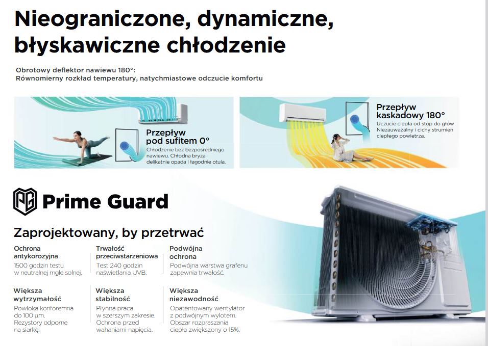 Dodatkowo, klimatyzator wyposażony jest w obrotowy deflektor nawiewu 180°, który zapewnia równomierne rozprowadzenie powietrza w pomieszczeniu, co przyczynia się do szybszego osiągnięcia komfortowej temperatury .