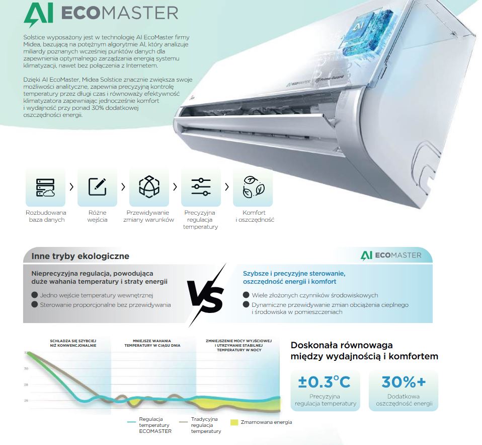 Sercem Midea Solstice jest technologia AI EcoMaster, która na podstawie analizy danych w czasie rzeczywistym przewiduje obciążenie cieplne i optymalizuje działanie urządzenia. Dzięki temu klimatyzator działa szybciej, zużywając mniej energii i zapewniając bardziej stabilną temperaturę w pomieszczeniu, zmniejszając straty energii aż o 30% w porównaniu do tradycyjnych urządzeń.
