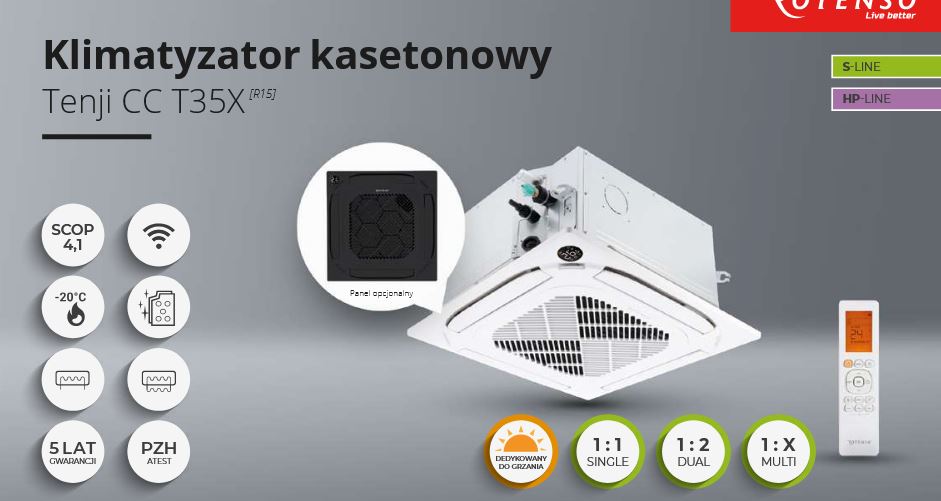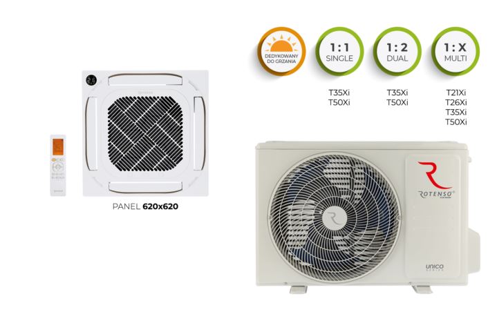 Klimatyzator kasetonowy Rotenso® Tenji CC jest dostępny w wymiarze 620×620 i mocach (od 3,5 kW do 5,3 kW), w klasie chłodzenia A++. Dzięki konstrukcji nawiewu 360° wydajnie rozprowadza powietrze w pomieszczeniu, zapewniając skuteczne chłodzenie lub grzanie.
