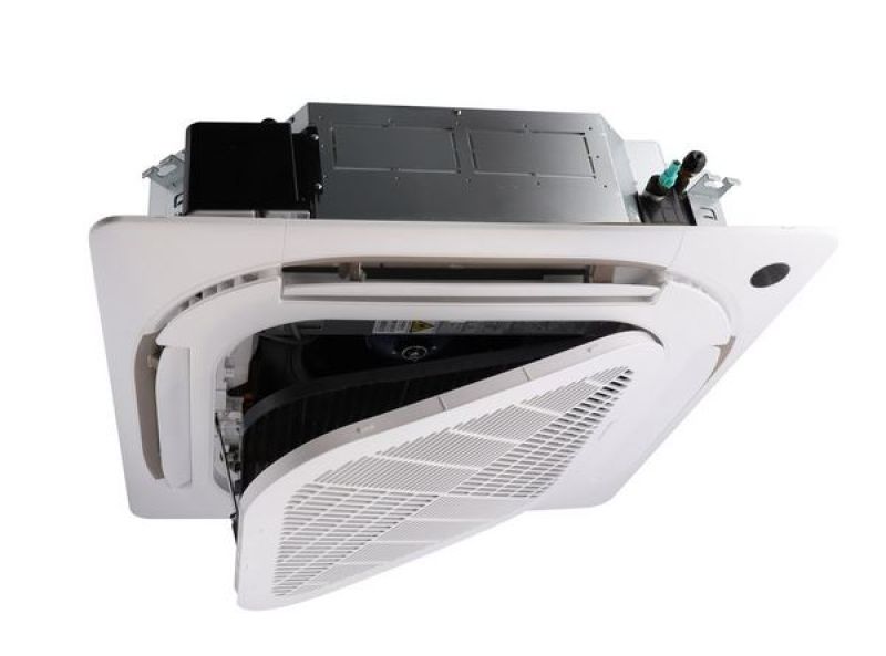Klimatyzatory kasetonowe są projektowane do montażu w sufitach podwieszanych, bo wtedy można je częściowo lub całkowicie zabudować i widać tylko kratkę nawiewu.