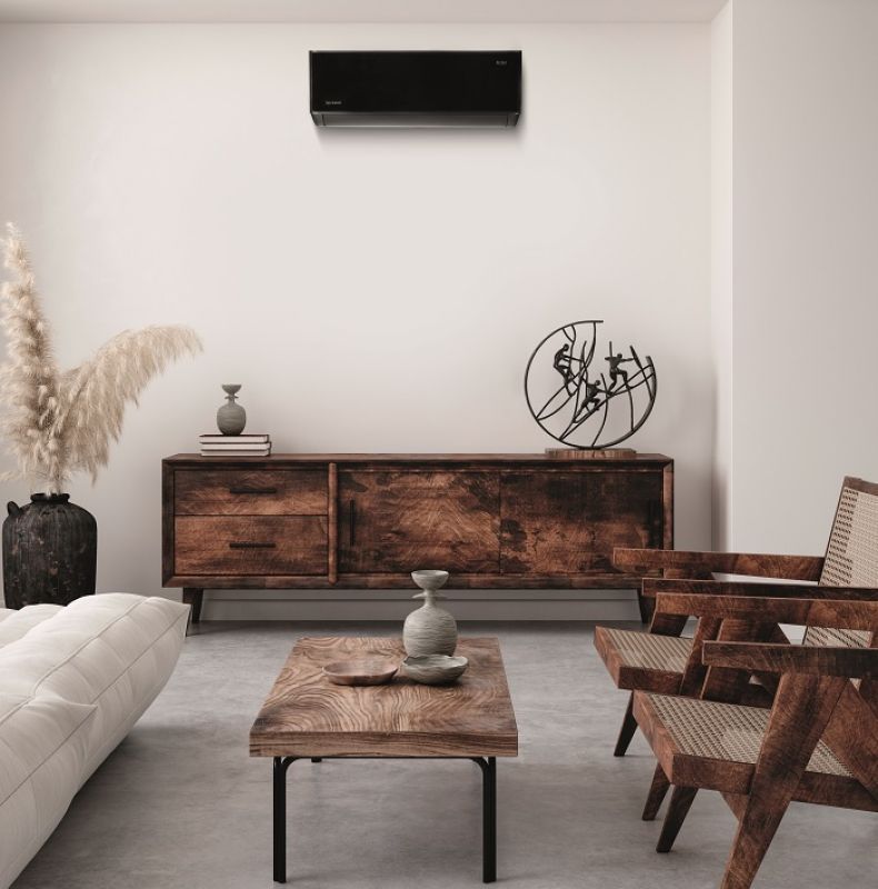 Klimatyzacja z serii Teta Mirror X to doskonała propozycja dla przestrzeni, gdzie dominuje kolor czarny. Mieszanina matowej obudowy i lustrzanego panelu frontowego umożliwia harmonijną integrację klimatyzatora z wnętrzami, które łączą naturalne materiały z błyszczącymi akcentami.