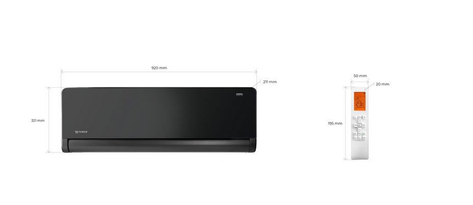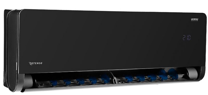 Klimatyzator ścienny Rotenso Versu Mirror z przednim, lustrzanym panelem w czarnym kolorze oraz boczną obudową w ciemno-szarej kolorystyce.