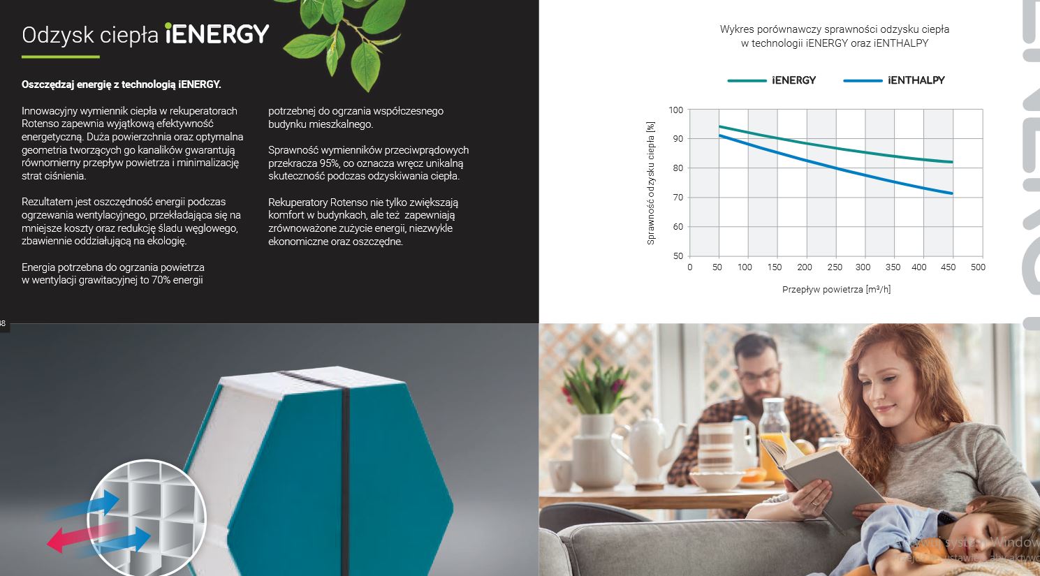 Wymiennik iEnergy zapewnia bardzo wysoki odzysk ciepła ( 90%), jednak bez odzysku wilgoci, co skutkuje niższą wilgotnością powietrza (ok. 23%)