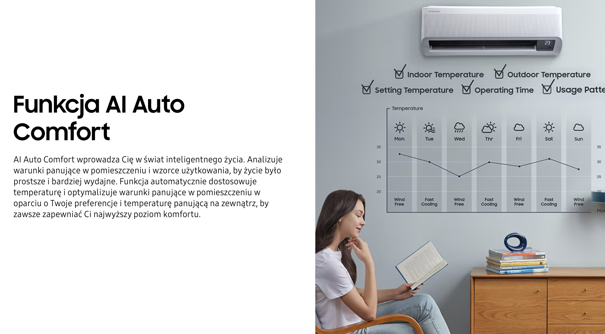 Inteligentna regulacja eliminuje konieczność manualnej obsługi, a jednocześnie pomaga oszczędzać na rachunkach za prąd. Z Samsung Wind-Free Avant S2 Black możesz cieszyć się idealnym klimatem w domu, bez potrzeby ciągłej zmiany ustawień.