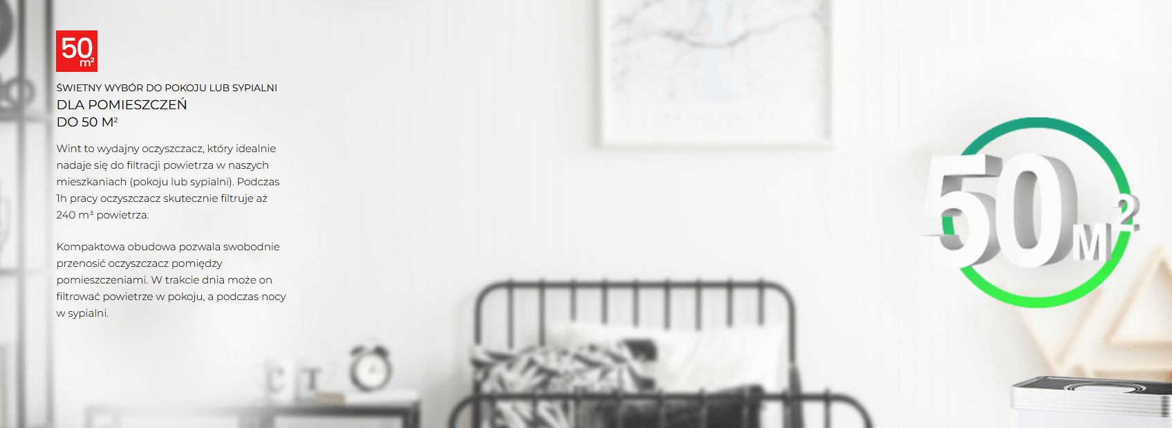- Świetny wybór do pokoju lub sypialni Dla pomieszczeń do 50 m2 Wint to wydajny oczyszczacz, który idealnie nadaje się do filtracji powietrza w naszych mieszkaniach (pokoju lub sypialni). Podczas 1h pracy oczyszczacz skutecznie filtruje aż 240 m3 powietrza. Kompaktowa obudowa pozwala swobodnie przenosić oczyszczacz pomiędzy pomieszczeniami.
