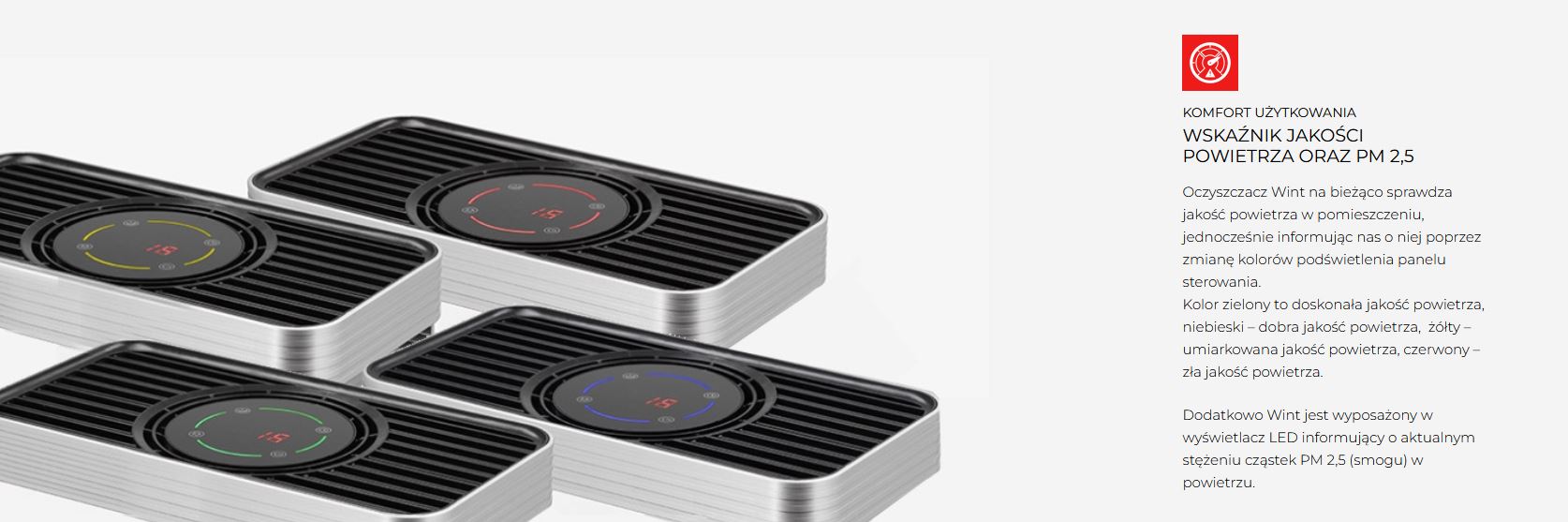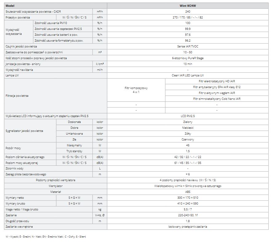 - 6-etapowe oczyszczanie powietrza - w oczyszczaczu zachodzi 6-etapowe oczyszczanie powietrza. Wint jest wyposażony w filtr kompozytowy 4 w 1, w którym znajdują się filtry: antybakteryjny EPA klasy E11, elektrostatyczny HD iAIR, z aktywnym węglem iAIR i zimnokatalityczny Cold Nano iAIR. Dodatkowo powietrze jest sterylizowane wiązką promieniowania UV, a ostatnim, szóstym etapem filtracji jest uzupełnienie powietrza w jony ujemne.