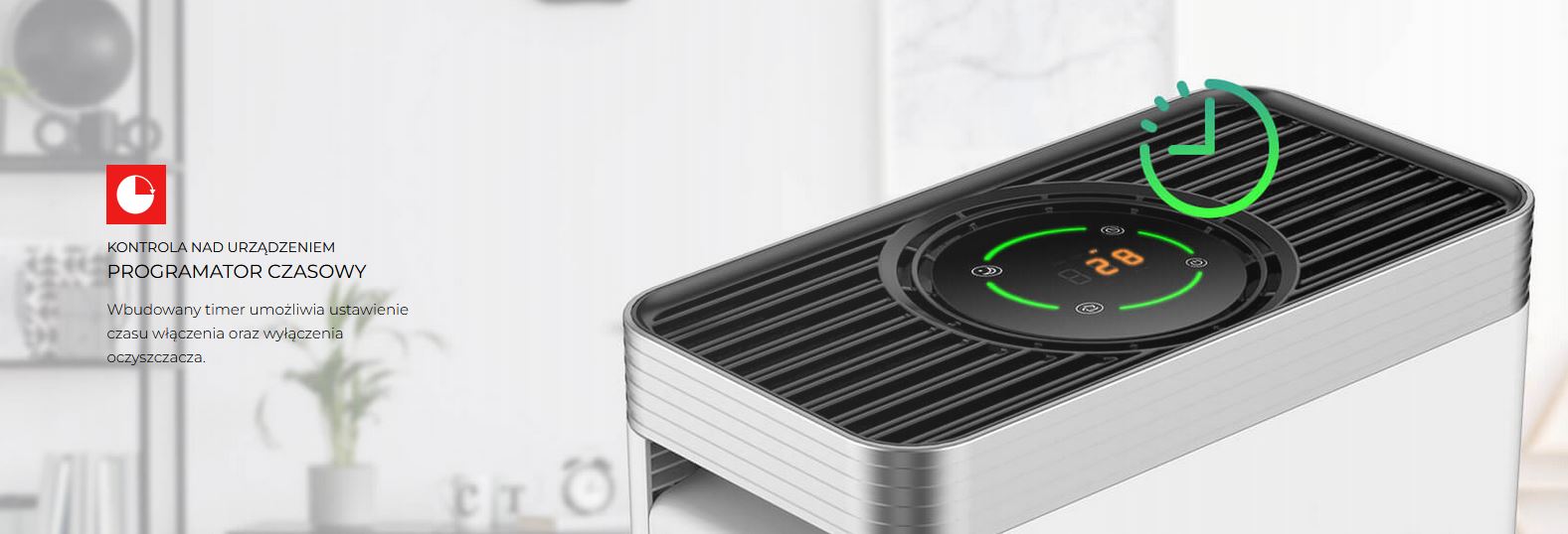 - Kontrola nad urządzeniem Programator czasowy - Wbudowany timer umożliwia ustawienie czasu włączenia oraz wyłączenia oczyszczacza.