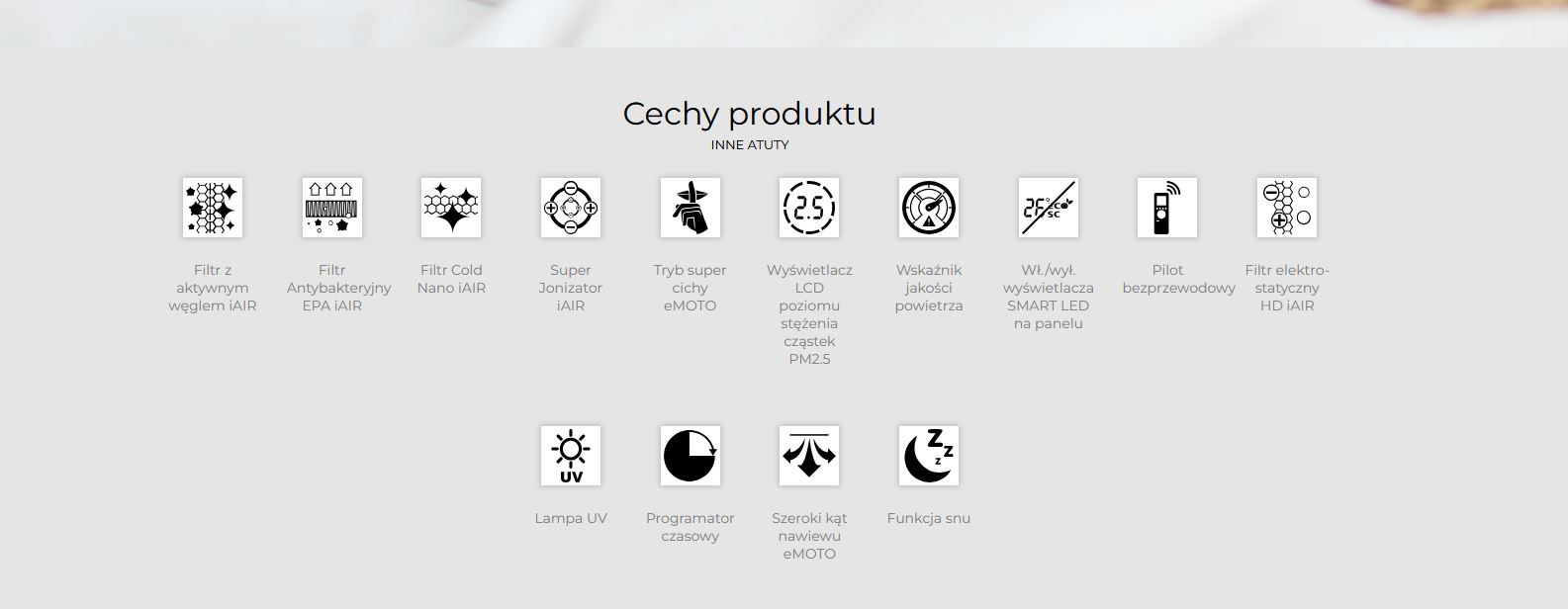 - Super Jonizator iAIR - Poprzez wytworzenie ujemnych jonów w ilości do 10 mln/cm³ filtr eliminuje z powietrza wirusy, bakterie, roztocza oraz alergeny. Nieprzyjemne zapachy zostają wyeliminowane praktycznie natychmiast po kontakcie jonizatora z zanieczyszczonym powietrzem