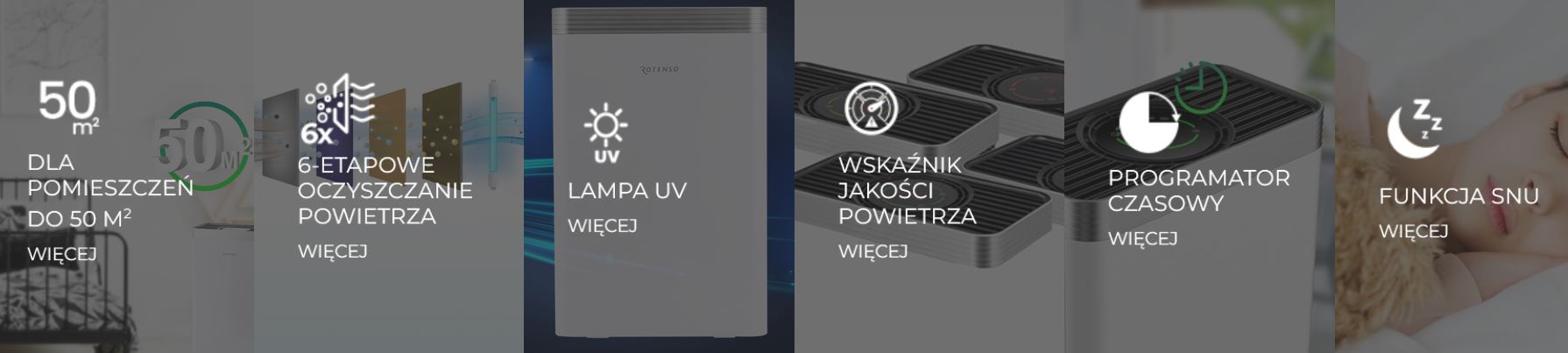 - Dodatkowo powietrze jest sterylizowane wiązką promieniowania UV, a ostatnim, szóstym etapem filtracji jest uzupełnienie powietrza w jony ujemne.